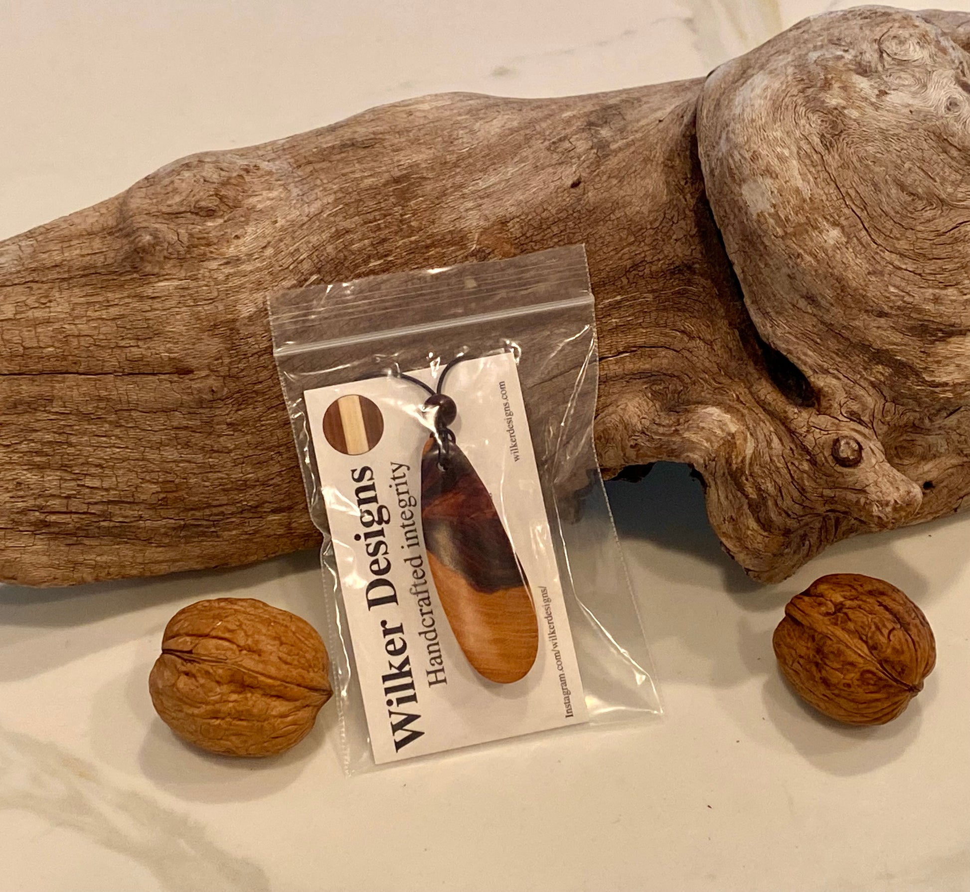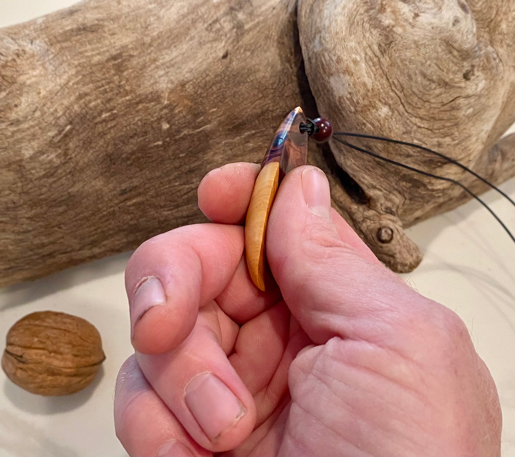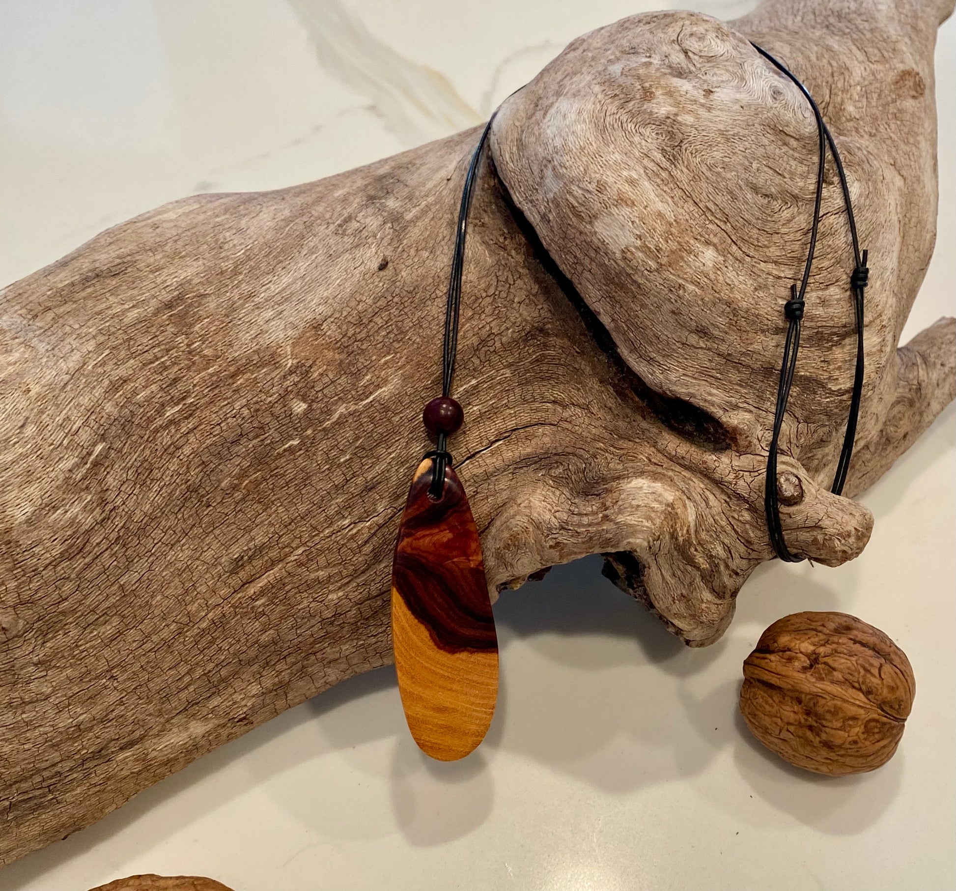 Made with a lighter piece of brown ebony. Buffed to a smooth and glossy finish. Has 1mm adjustable leather cord.