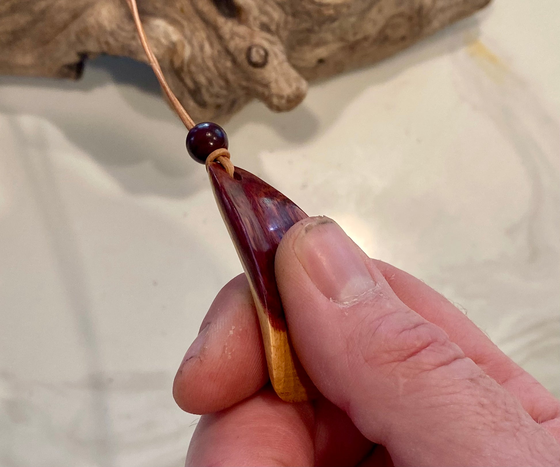 Purple Heart pendant has beautiful contrast of heartwood and sapwood. Finely polished pendant fist ergonomically between thumb and forefinger. Polished to high sheen and finished with carnauba wax. Has 1 mm adjustable leather cord.